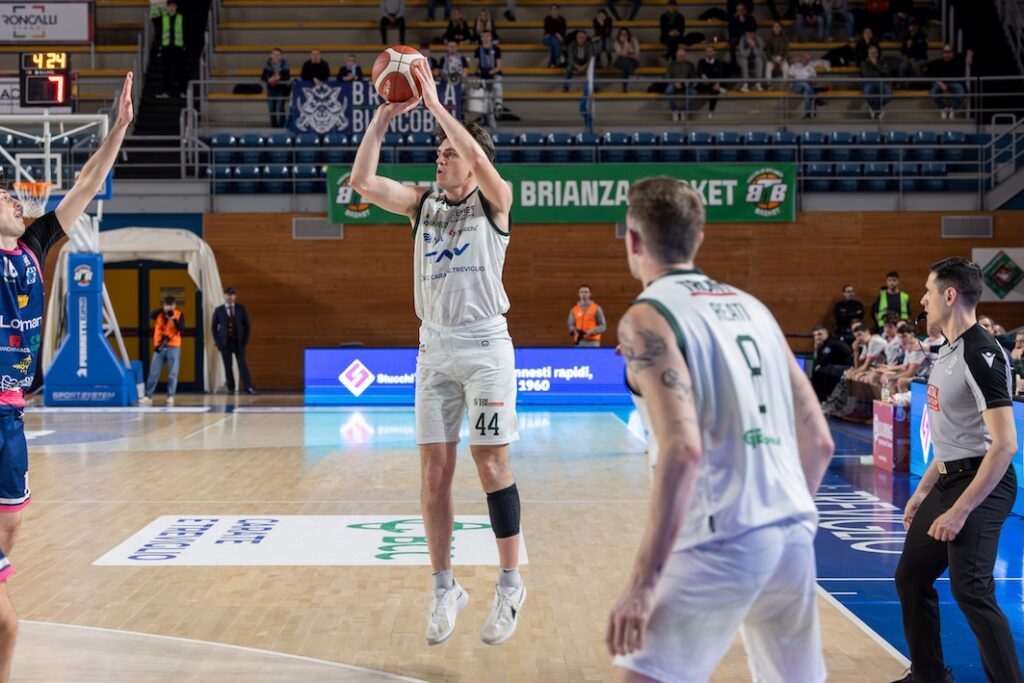 Il derby lombardo del turno infrasettimanale vede opporsi i due quintetti con Rubbini, Restelli, Reati, Taflaj e Marciuš per i padroni di casa, Chaves, Giacomini, Cacace, Gnecchi e Stefani per gli ospiti. Taflaj e Cacace sono i più performanti (6-6), poi i biancoverdi (senza Galassi, out per infortunio) lanciano un bel segnale fatto di difesa e buone soluzioni in attacco, soprattutto dal pitturato. Marciuš completa un 12-0 che issa i biancoverdi sul 18-6 (8′). Chavez sblocca i suoi dall’arco, ma Morina replica con tre liberi. Alla prima sirena è 21-11.